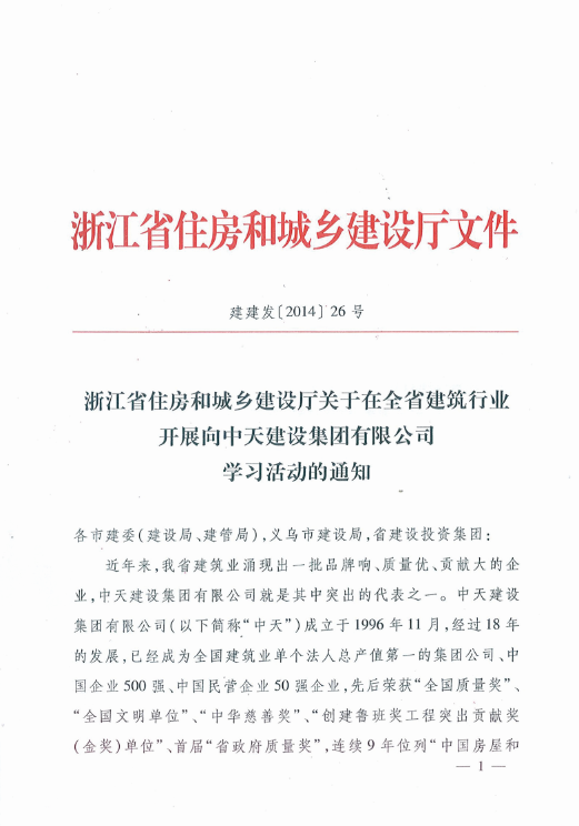《浙江省住房和城乡建设厅关于在全省建筑行业开展向9001DCC金沙建设集团有限公司学习活动的通知》